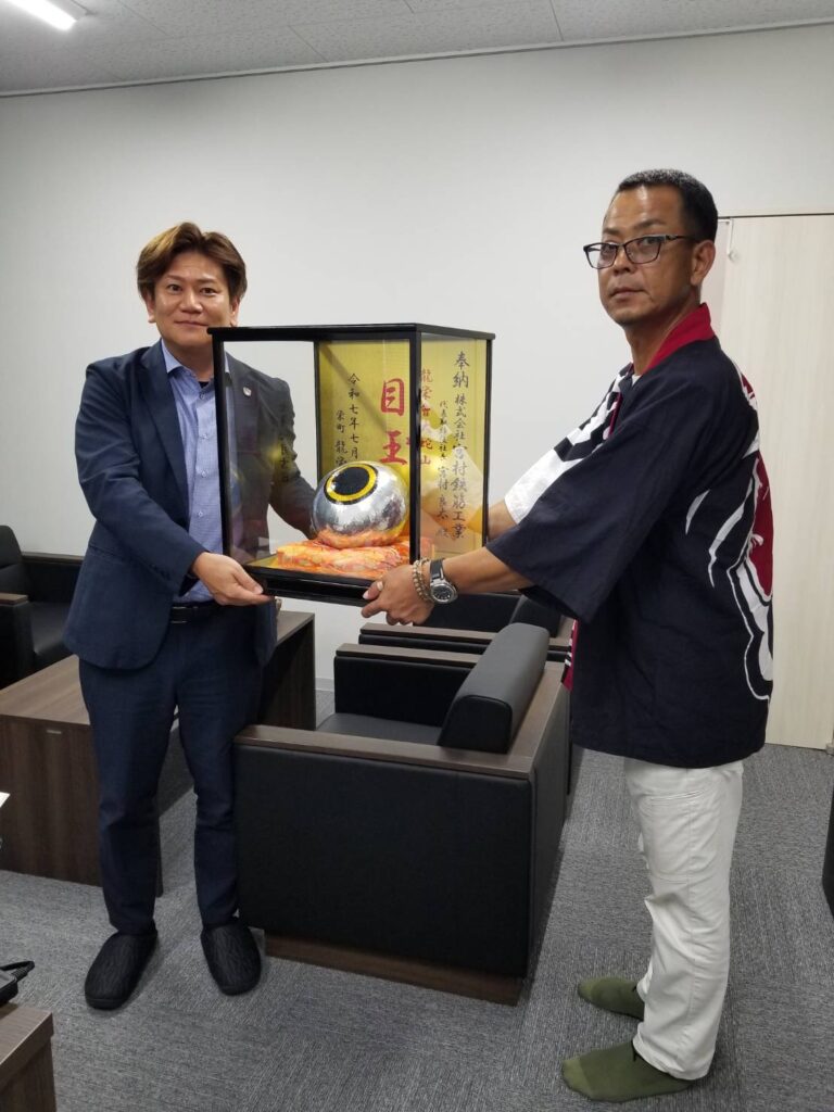 お知らせ 大蛇山の目玉様 投稿日:2025年8月28日 2025.8.28、本日、大蛇山の目玉がやってきました! 栄町 龍栄會様より奉納 目玉を受け取る社長 めちゃめちゃカッコいい!!! そして、かなり厚めの座布団に座ってらっしゃる!! とても縁起が良さそうです。 社長室に飾らせていただきます。 貴重な目玉ありがとうございました。