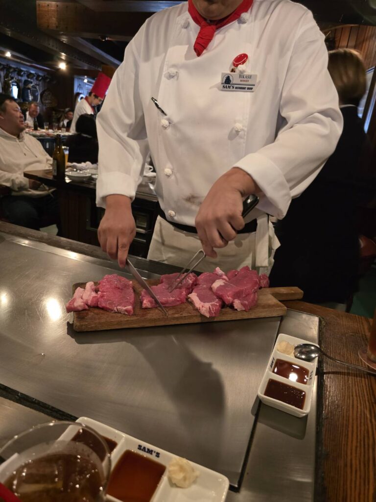目の前でステーキを焼いてくれます。